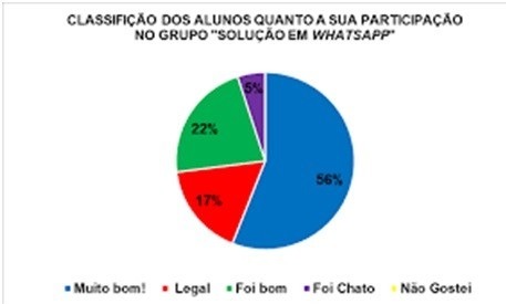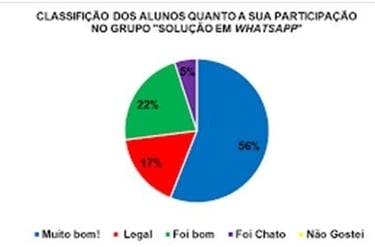 No gráfico a seguir, podemos ver na pesquisa realizada através da publicação DO WHATSAPP® NA EDUCAÇÃO: ANÁLISE DO APLICATIVO NO ENSINO DE QUÍMICA (Revista Debates em Ensino de Química 7(1), 262-280), sobre aceitação, aonde vemos que 56% avaliaram como "Muito Bom" a interação como "Solução em WhatsApp":